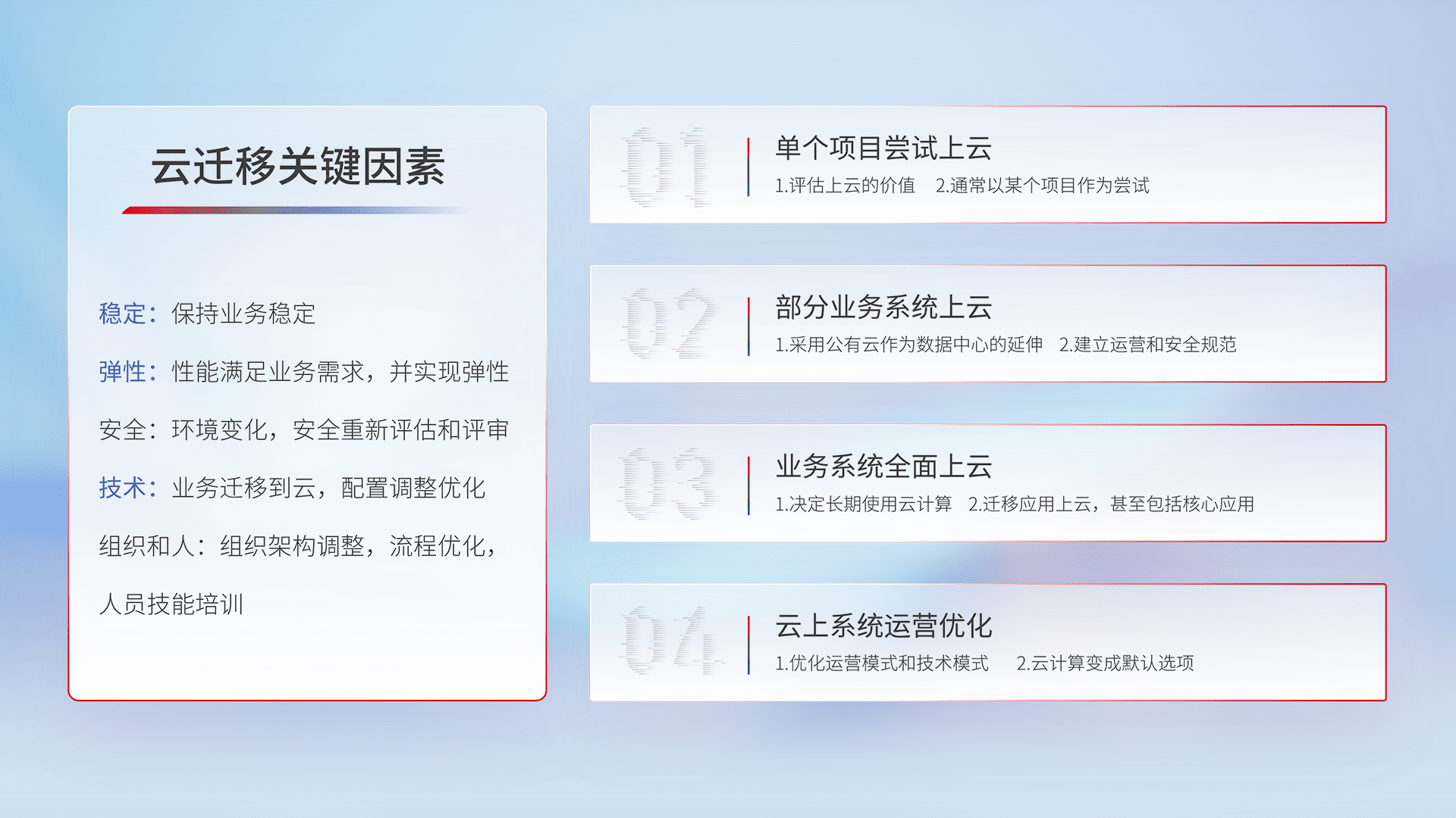 结合实际业务,,从规划设计、、云平台选型、、、、云原生改造、、数据迁移、、、集成交付,,,,迁移全过程为客户识别最佳上云路径,,,做好风险识别管理,,设计网络架构、、身份权限、、安全审计合规、、、、操作审计、、日志审计、、、监控告警策略、、、、多站点容灾设计等,,,,对云上基础设施进行整体规划,,,提升IT治理水平,,以满足弹性、、、、高可用、、、、高性能的需求。。。