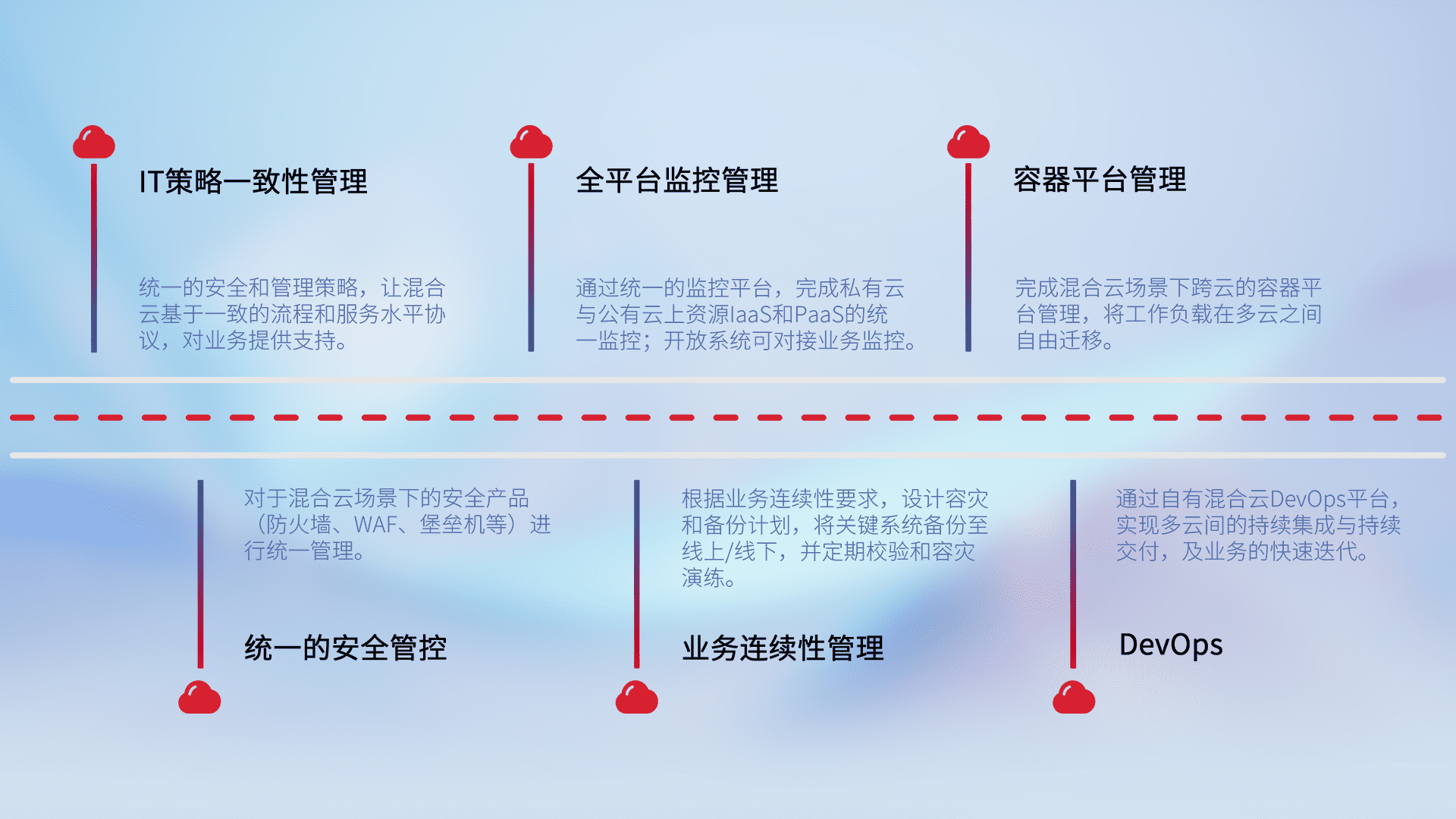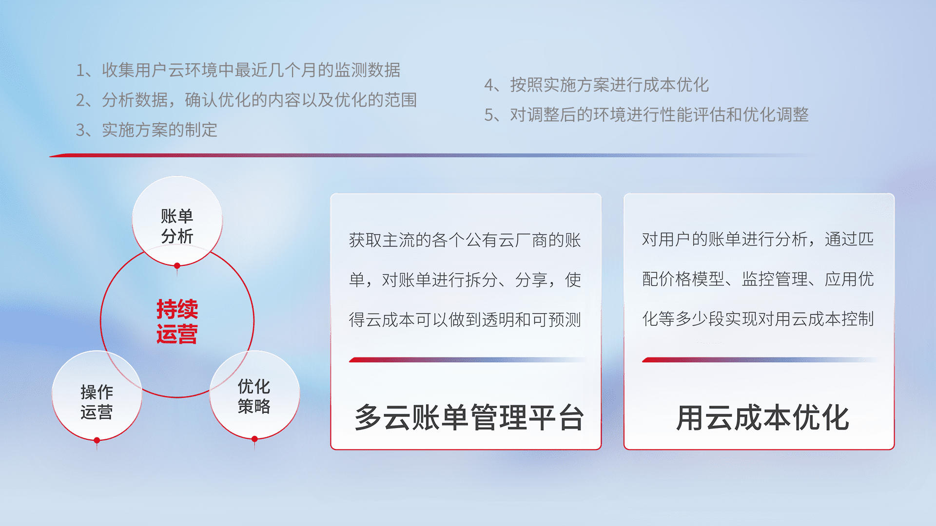 通过多云纳管,,,以统一的资源数据模型把客户的云资源进行抽象和封装,,,,进而实现对多云资源的统一操作,,保障云资源管理的可靠性、、、稳定性与可用性。。。量身定制化运维内容,,,配置、、开发运维、、、补丁管理、、、备份、、、、监控、、、认证和访问管理、、、、审计和日常巡检等,,,,保障在用云过程中的可靠度,,,,稳定度以及高可用率。。。。
