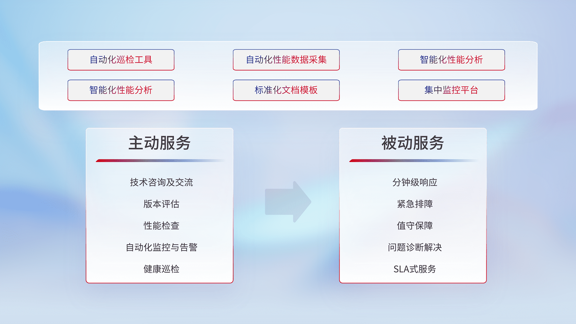 智能化工具和标准化文档,,,保障服务质量,,,提供主动服务(包含技术咨询、、版本评估、、、性能检查、、、、自动化监控与告警、、、健康巡检)和被动服务包含(分钟级响应、、、、紧急排障、、、、值守保障、、、问题诊断解决、、SLA服务)。。。。